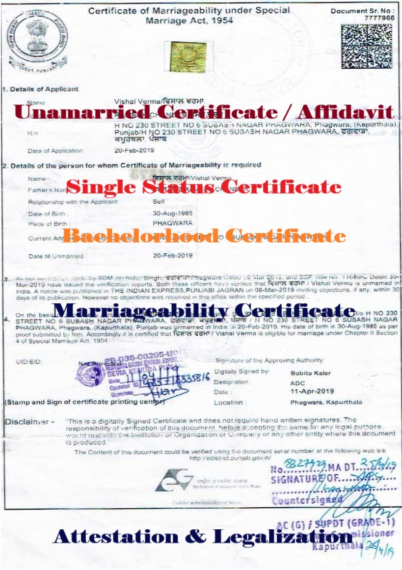 We provide Single Status / Bachelorhood Certificate / Unmarried Affidavit Attestation in India. When you require an Unmarried Affidavit Attestation, contact us and we will provide our best services to get it done at your door step.
